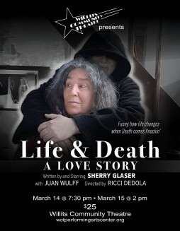 Local treasure, award-winning actress and solo performer Sherry Glaser performs in her latest work, Life and Death – A Love Story, at the Willits Community Theatre on March 14 and 15. Glaser offers an extra dark comedy with a unique revelation where the question is asked: Can life and death reconcile their differences and find love? Shows are Saturday, March 14 at 7:30pm and a Sunday, March 15 matinee at 2:00pm. Tickets are $25 and available online at: www.wctperformingartscenter.org and at the door.