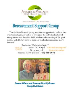 This 8-week group provides an opportunity to learn the symptoms of grief, as well as to recognize the individual nature of its expression and duration. With a fuller understanding of the grief process and effective ways to cope, we can find meaning and move forward. This is a closed group with a maximum of 8 participants. Please call Suzanne to register: 707-456-9676.