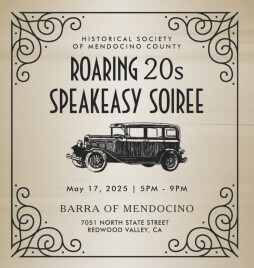 Don't miss the Historical Society of Mendocino County's 2nd annual dinner and auction to benefit the Society! Transport yourself to the 1920s at our Speakeasy Soiree and explore the history of bootlegging in Mendocino County. Join us at Barra of Mendocino Winery & Event Center to enjoy music from the era and a delectable menu fashioned from the favorite foods of "notorious" bootleggers by chef Matthew Allison. There will be a live and silent auction filled with unforgettable Mendocino County experiences. The auction continues to support the opening of the Held-Poage Memorial Home Museum and the Historical Society’s effort to catalog its extensive collection. We invite you to dress in 1920s attire, however it is not required. See you there on Saturday May 17, 2025 at 5 P.M.