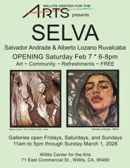 Experience SELVA, a collaborative exhibit featuring painter Salvador Andrade and ceramic artist Alberto Lozano Ruvalcaba. Join us for a transformational art experience with these two young artists opening on Saturday February 7, 2026 from 6 to 8pm. As always, our festive openings are free events offering art, food and drink, and an interesting community experience. SELVA will remain on exhibit at Willits Center for the Arts Fridays, Saturdays, and Sundays from 11am to 5pm through Sunday March 1, 2026. WCA is located at 71 East Commercial St., Willits, CA, 95490.