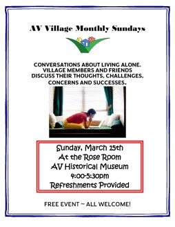 The Anderson Valley Village Presents: CONVERSATIONS ABOUT LIVING ALONE. VILLAGE MEMBERS AND FRIENDS DISCUSS THEIR THOUGHTS, CHALLENGES, CONCERNS AND SUCCESSES