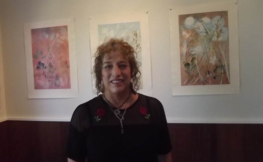 On the other end of the room, and spilling into a foyer just off the garden, Christine Carr, who came to Willits from Iowa by way of Virginia, explained her work. She places photoshopped images of burned landscapes into the outlines of maps of California’s largest fires, based on CalFire information dating back to 1932.