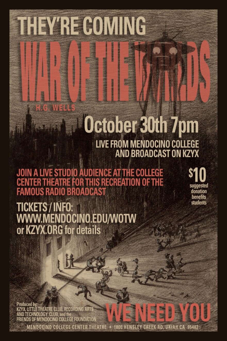 Station News War Of The Worlds Audio Here! Mendocino County Public Broadcasting Published October 30, 2018 at 10:07 AM PDT Facebook Twitter LinkedIn Email On Tuesday October 30th KZYX aired a live broadcast in collaboration with Mendocino College! The Audio of the performance is here:http://media.kzyx.org/mp3/War%20Of%20The%20Worlds%20EDITED.mp3